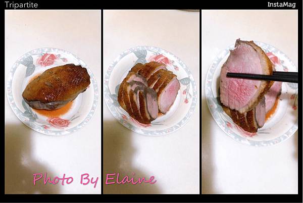 Elaine是採取微波加熱的方式,原以為這鴨胸會是乾柴的,讓我感到驚呼的是這鴨胸未免也太鮮嫩多汁了吧!當我在切片時,能感受到滿滿的鴨胸肉汁,看到那粉嫩粉紅色的鴨胸,已讓我食指大動了,吃在嘴裡時,有種讓我說不出話來的Fu,不禁讓我懷疑的是這是鴨胸嗎?鴨胸和紅酒真得是絕配啊!