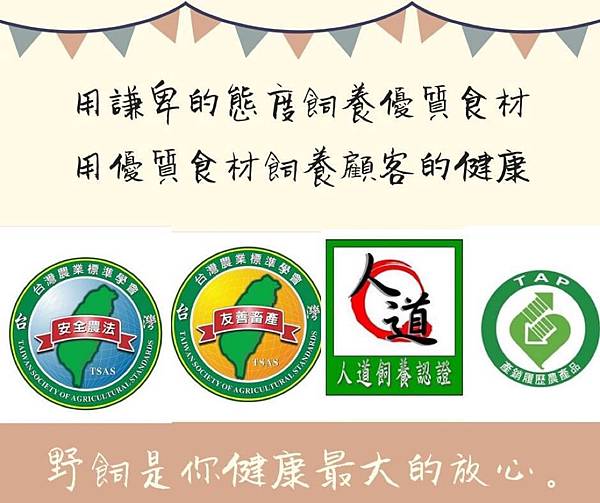 努力取得認證,飼養過程不敢有絲毫馬虎,如飼糧、健康、防疫、人道放牧空間、安全衛生屠宰等,均有認證單位把關與指導,因此消費者可以安心食用我們生產的健康土雞。