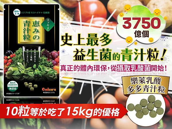 - 「A-17乳酸菌」是萬中選一的益生菌,6000倍的好菌量從基底打造腸道環境,僅10粒青汁粒所含3750億個乳酸菌,就等於37.5個優格、也就是說等於吃了15公斤的優格!【菌數高】【效果好】【不須冷藏】